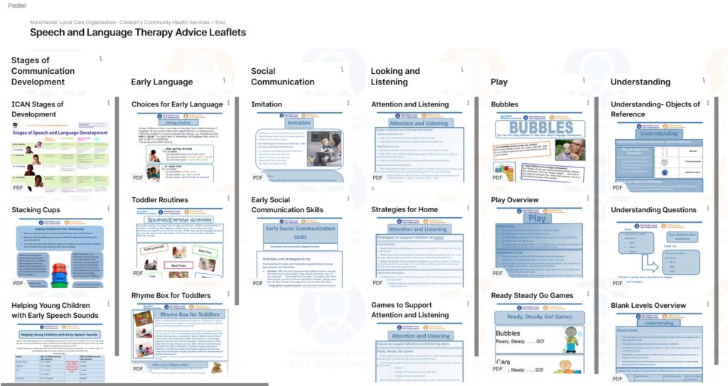 To support families at home, here are the links for Trafford Speech and Language Service support Padlet, providing a bank of practical resources that parents can refer to before making a referral to the Speech and Language Service. These resources include guidance sheets, activity ideas, and strategies for supporting speech sounds, vocabulary, listening, and attention through everyday routines. Using these tools consistently at home, alongside support in place at school, can often help address early concerns and ensure that, if a referral is needed, school can already evidence the support that has been put in place.